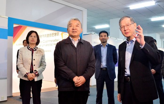 在参观中德共建合肥学院30周年成果展的过程中,王其东介绍了我校的基本情况,我校始终坚持“地方性、应用型、国际化”的办学定位,近些年大力开展教育改革,对标地方产业发展需求,加强校企合作,深入推进产教融合,实现产学研合作育人,培养应用型人才,服务地方经济社会发展。同时广泛开展国际合作,探索“双元制”人才培养模式,不断提高人才培养质量,构建起具有鲜明特色的应用型人才培养体系。